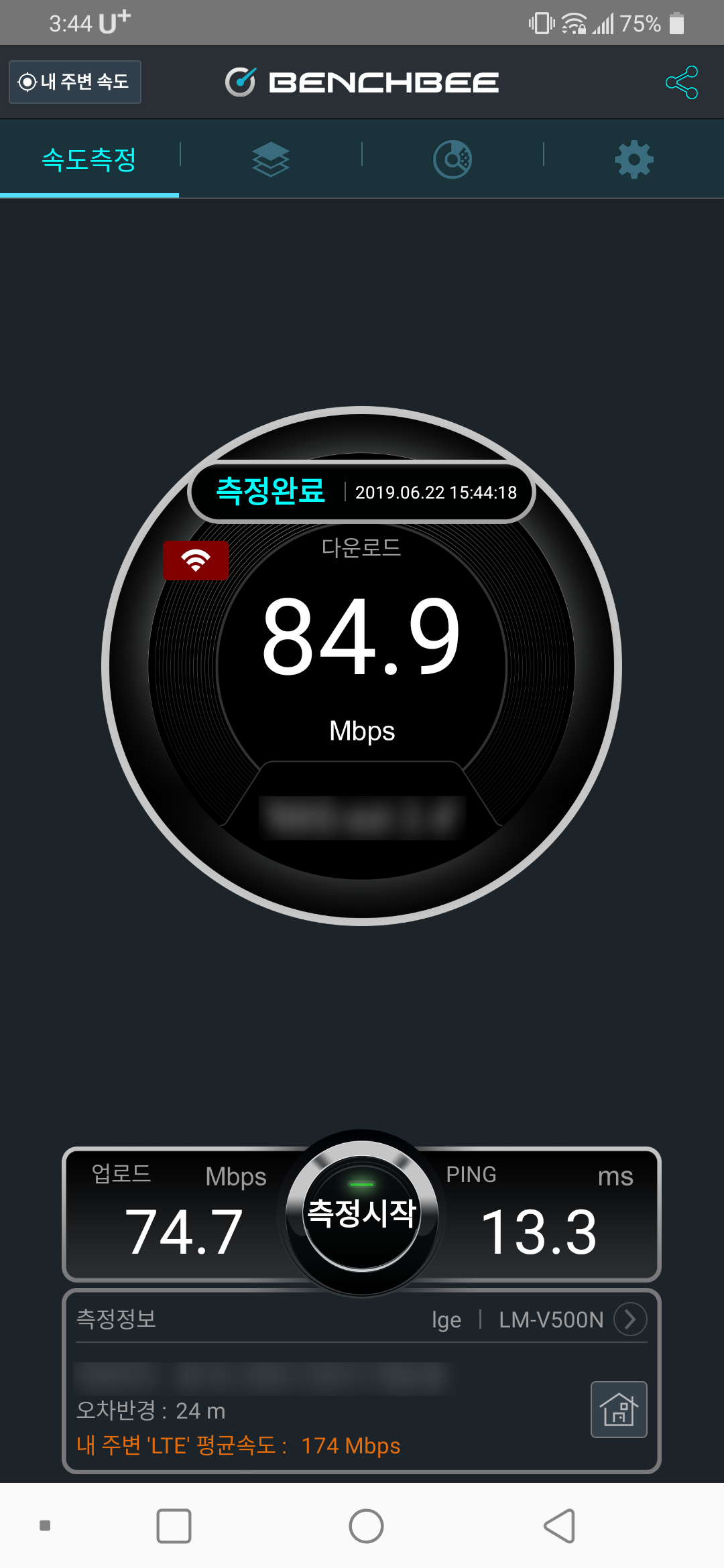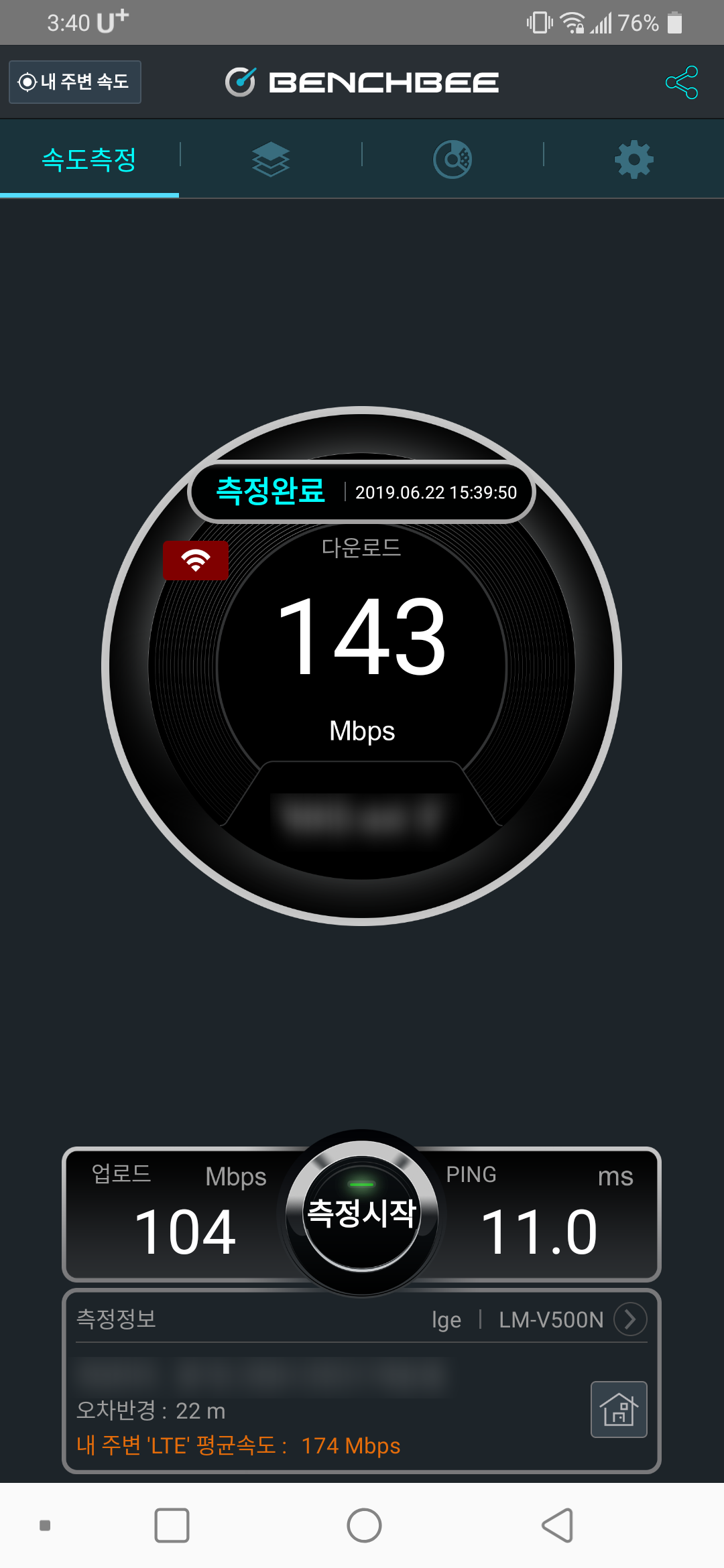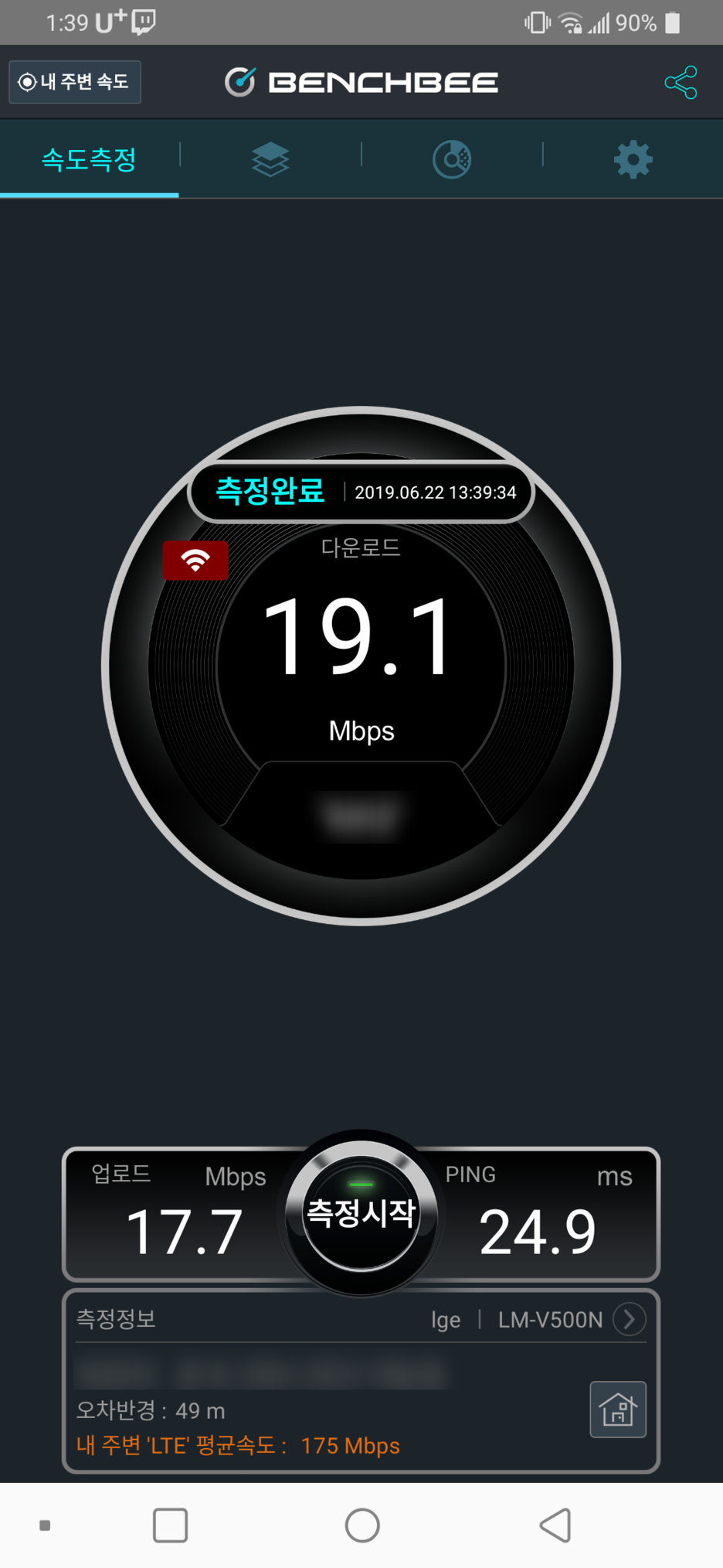 설치 후 벤치비를 통해서 다시 와이파이 연결속도를 측정했습니다.