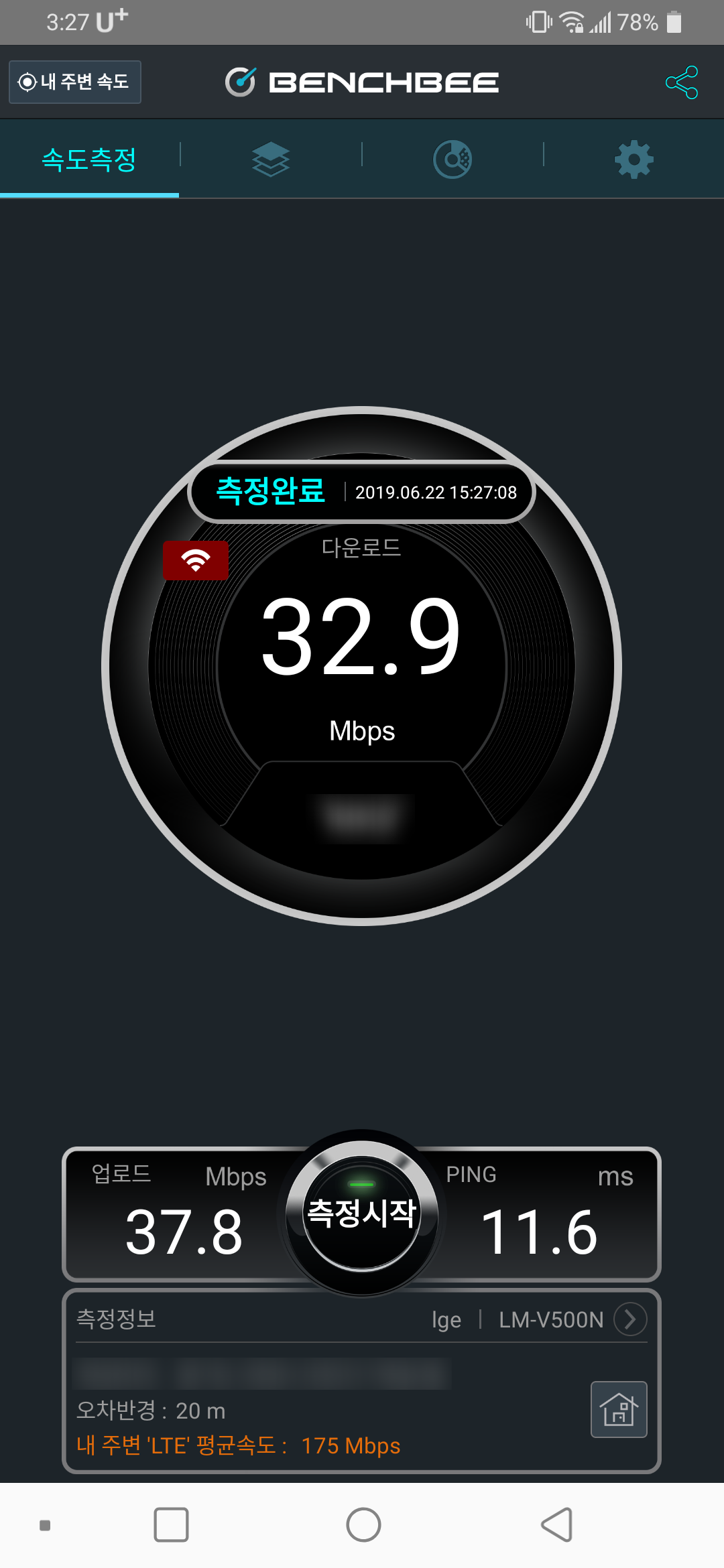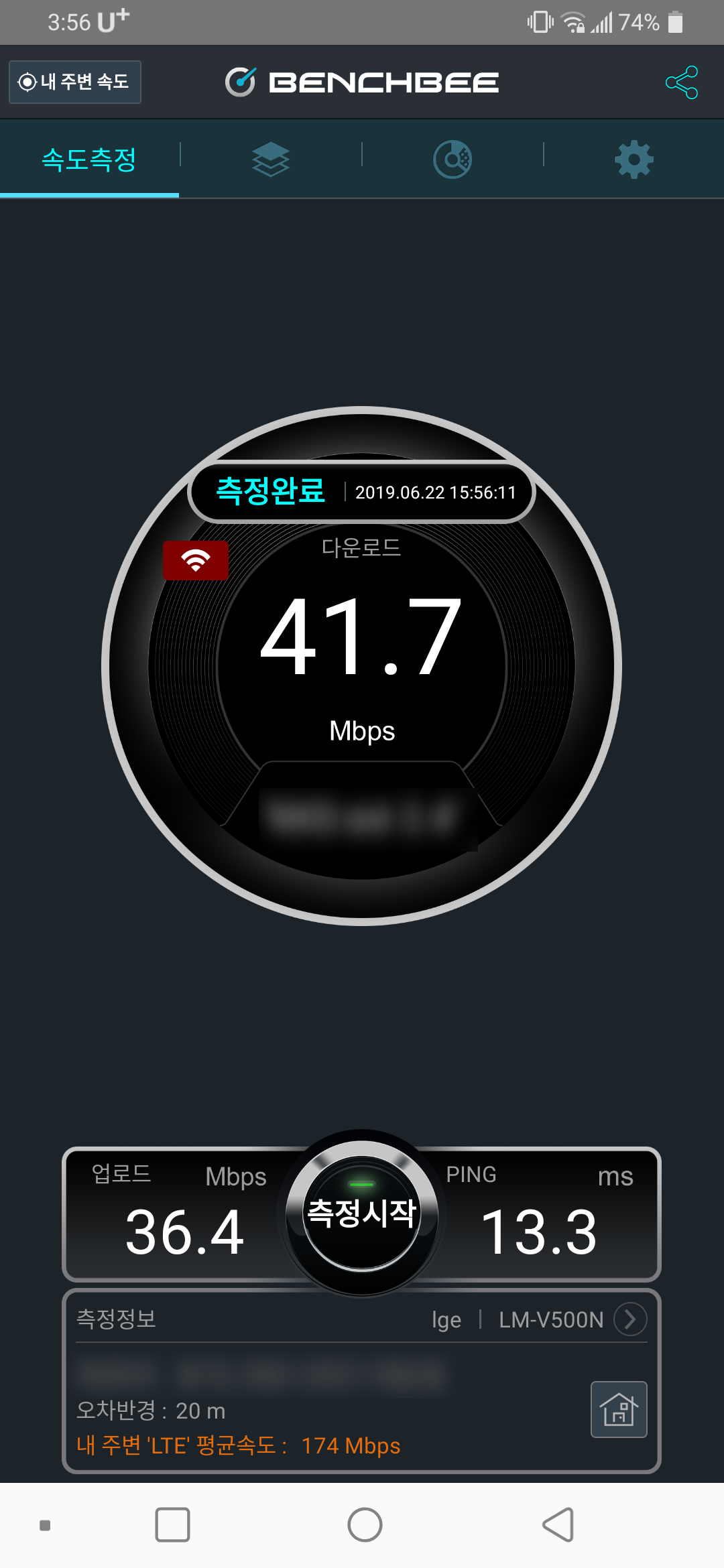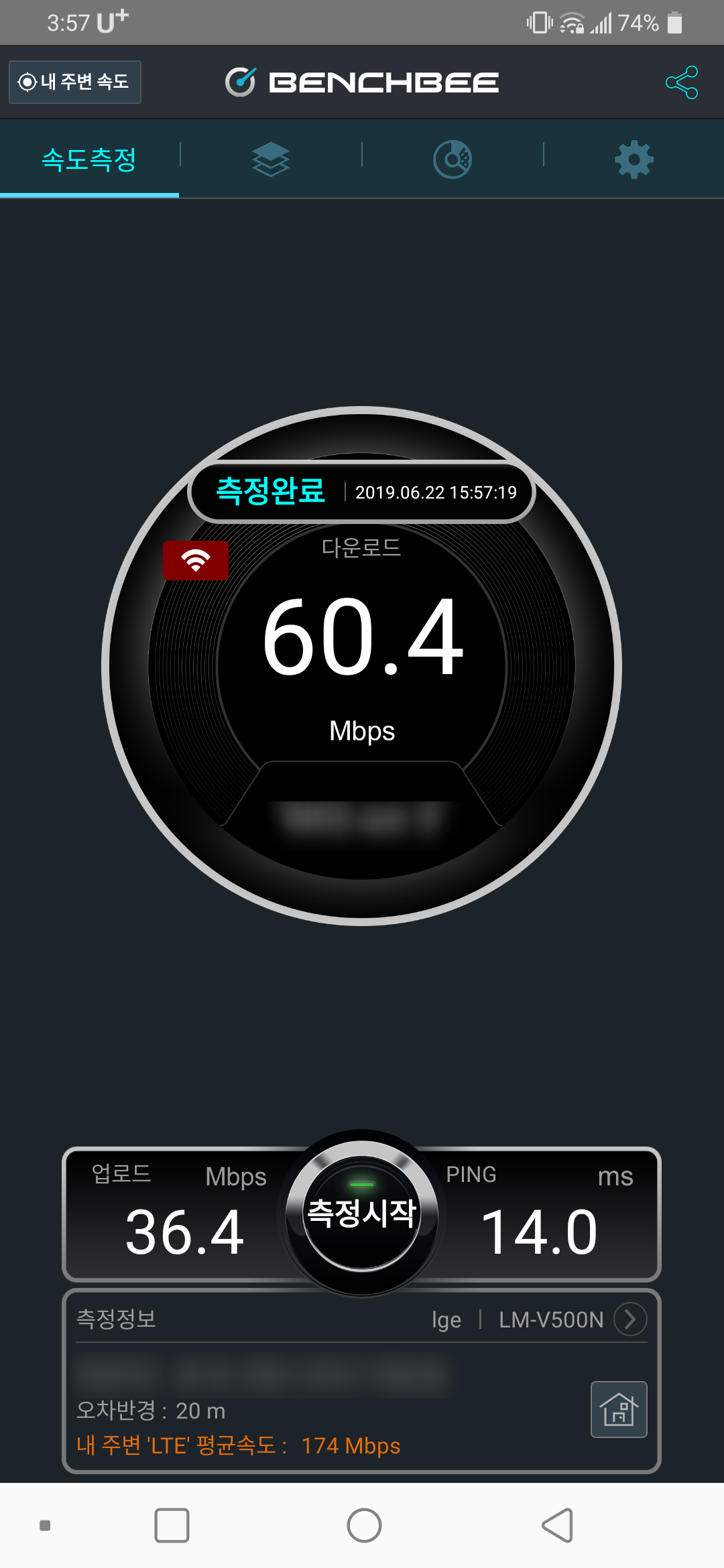 설치 후 벤치비를 통해서 다시 와이파이 연결속도를 측정했습니다.