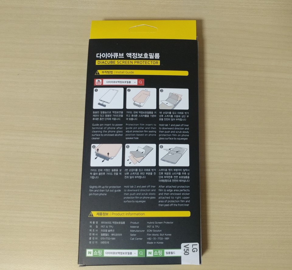 후면에는 다이아큐브 하드코팅 액정보호필름 부착방법과 제품정보가 나와있습니다.